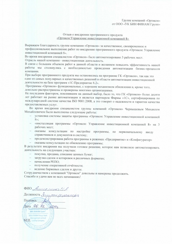 Отзыв о внедрении программного продукта «Ортикон:Управление инвестиционной компанией 8»