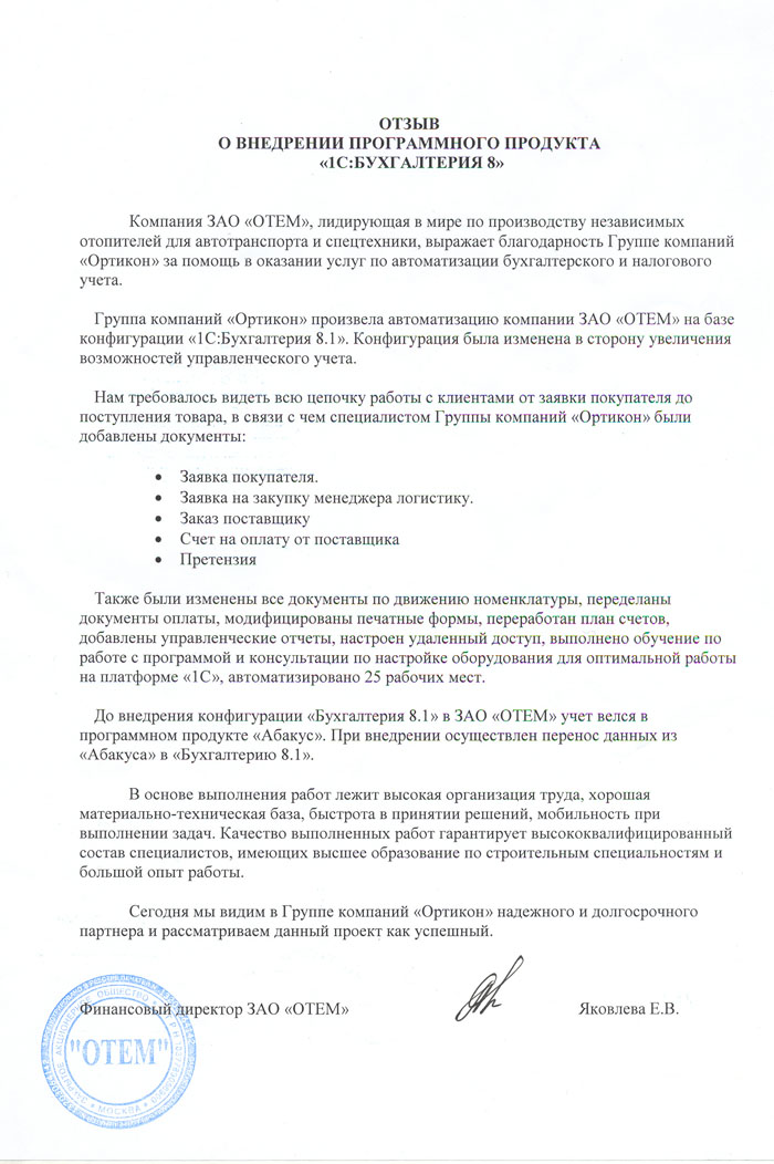 Специалистами Группы компаний "Ортикон" произведена автоматизация компании ЗАО "ОТЕМ" с помощью программного продукта "1С:Бухгалтерия 8". При помощи данной программы удалось автоматизировать бухгалтерский и налоговый учет, включая подготовку обязательной (регламентированной) отчетности. Методика бухгалтерского учета обеспечивает одновременную регистрацию каждой записи хозяйственной операции как по счетам бухгалтерского учета, так и по необходимым разрезам аналитического учета, количественного и валютного учета. Обучение пользователей не потребовалось.