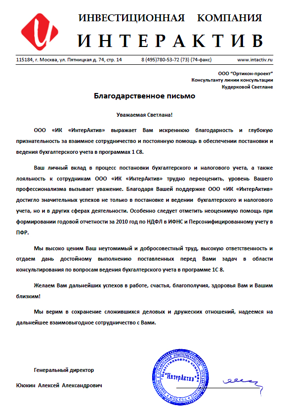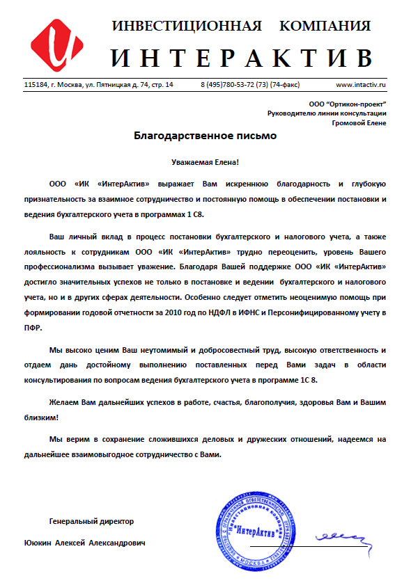 Благодарственные письма от Инвестиционной компании "ИнтерАктив" линии технической поддержки ГК "Ортикон"